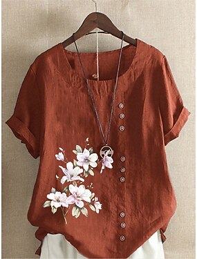 Maglietta da donna 100% cotone Floreale Streetwear Maniche Corte Collo A Giro Regular Top Simile al Lino Vacanza Giornaliero Uscita Bottoni Stampa Blu Navy Blu Verde Militare Azzurro Caffè Estate