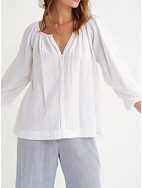 Per donna Camicia Blusa Camicia di cotone Arricciato Bottoni Tinta unica Elegante Classico Moderno Manica 3/4 Scollo a V Top Regolari Quotidiano Ferie Uscire Nero Bianco Verde chiaro Blu marino