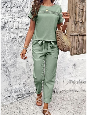 Per donna Camicia Set ispirati al lino Set da due pezzi Pantaloni Manica Corta Girocollo Tinta unica Coulisse Moda Casual Quotidiano Nero Arancione Verde Primavera & Estate Vestibilità regolare