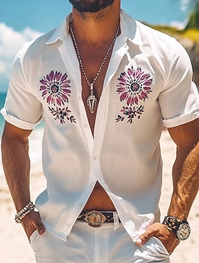 Per uomo Camicia Camicia di lino Abbigliamento da spiaggia Camicia hawaiana estiva Camicia con Bottoni Floreale Vacanza Ferie Bianco Manica Corta Collo ripiegato Estate Primavera Abbigliamento