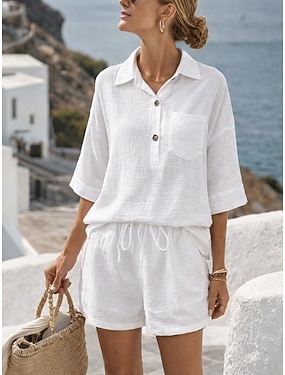 Per donna Set da due pezzi Camicia di cotone Set di Pantaloncini Manica Corta Colletto a Camicia Semplice Moda Streetwear Casuale Quotidiano All'aperto Nero Avorio Rosa Estate Vestibilità regolare