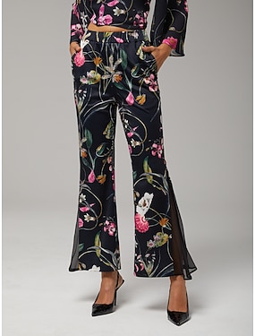 pantaloni da donna in tessuto elasticizzato con stampa floreale in chiffon, pannelli trasparenti, gamba svasata, elastico in vita, eleganti, comodi, quotidiani, da lavoro, autunno