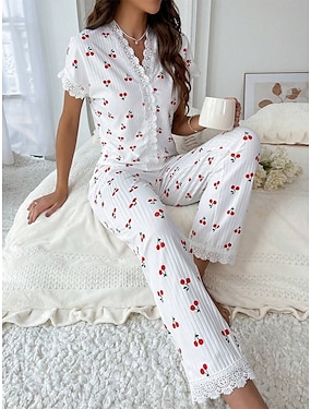 Per donna Set Pigiama Casual Comfort Ciliegia Elastico in vita Camicia Pantalone Casa Quotidiano Manica Corta Scollo a V Bianco Estate Primavera Autunno Vestibilità regolare