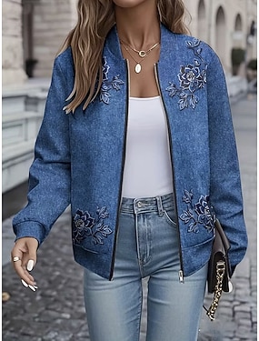 giacca casual con cerniera per le vacanze quotidiane, stampa floreale in denim