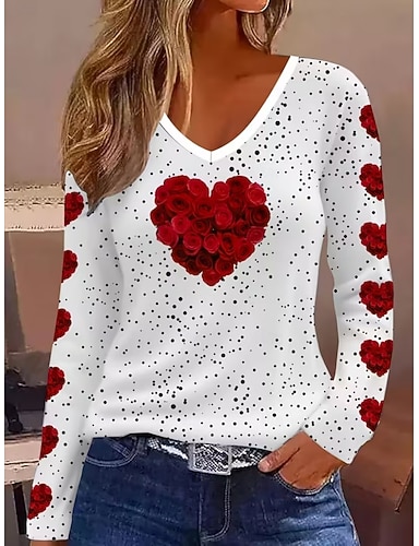 San Valentino Per donna Maglietta Stampato Cuore Grafico Vintage Elegante Classico Manica Lunga Scollo a V Top Regolari Quotidiano Bianco Primavera Autunno Inverno
