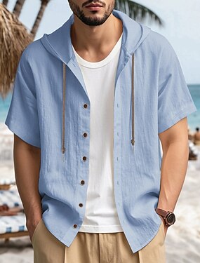 Per uomo Camicia camicia di lino Camicia estiva Camicia da spiaggia Tinta unica Da mare Informale Nero Bianco Blu Cachi Manica corta Con cappuccio Estate Primavera Abbigliamento