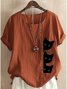 Camicia da donna in cotone 100% in lino con bottoni animale gattino elegante quotidiana alla moda manica corta colletto rotondo top regolari quotidiano vacanza indossare blu bianco giallo blu navy