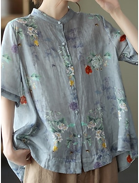 Camicia da donna in cotone 100% in lino blusa con bottoni stampa floreale grafica elegante casual manica corta colletto rotondo top regolari quotidiano uscendo bianco rosa viola marrone verde estate