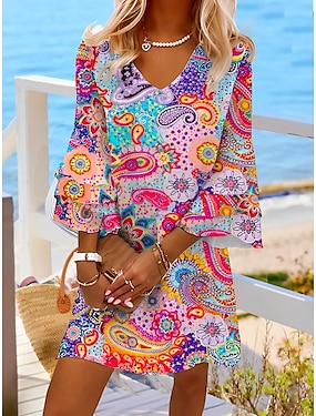 Per donna Mini abito Abito cachemire Abito casual Abiti Boho Chic Abito boho Boemia Etnico Linea A Da mare Strada Per eventi Morbido Floreale Motivo cashemire Manica a 3/4 A V Fucsia Estate