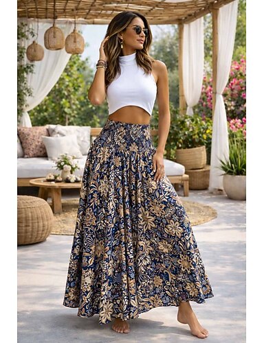 Per donna Elegante Moda Casual Maxi Vita media Gonne Floreale Arricciato Coulisse Micro-elastico Streetwear Uscire Blu Nero Giallo Rosso Estate Poliestere