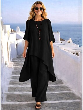 Per donna Set di Pantaloni Bolero Finto cotone e lino Mezza Manica Girocollo Tinta unica Moda Streetwear Casuale Quotidiano All'aperto Nero Bianco Vino Estate Vestibilità regolare