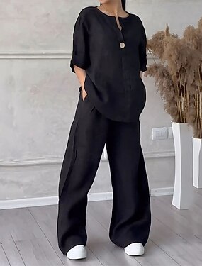 Per donna Finto cotone e lino Set Scollo a V Tinta unica 2 Pezzi Bottoni Moda Quotidiano Streetwear Nero Arancione Cachi Estate