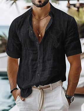 Per uomo Camicia Camicia di lino Camicia Estiva Abbigliamento da spiaggia Camicia con Bottoni Tinta unica Casuale Vacanza Nero Bianco Blu marino Azzurro cielo Manica Corta Colletto alla coreana
