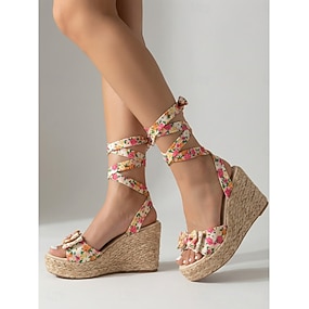 Sandali con zeppa rosa romantici da donna - comode scarpe espadrillas con plateau e lacci alla caviglia &Dettaglio del fiocco per resort all'aperto, vacanze estive &feste in giardino