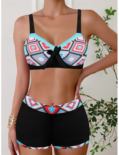 Costume da bagno bikini da donna a 2 pezzi boho con pantaloni schiena scoperta per vacanze in spiaggia color block geometrico scollatura a V senza maniche