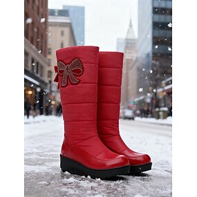 stivali invernali impermeabili da donna - stivali da neve trapuntati rossi con fiocco e dettagli in strass, suola antiscivolo, ideali per il tempo nevoso, attività all'aperto e abbigliamento invernale