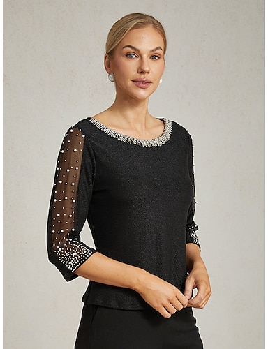 Per donna Top Eleganti Con perline Metallico Guanto Elegante Quotidiano Signore Manica 3/4 Girocollo Top Regolari Ospite di nozze Abbigliamento da sera Semi-Formale Nero Primavera Autunno Inverno
