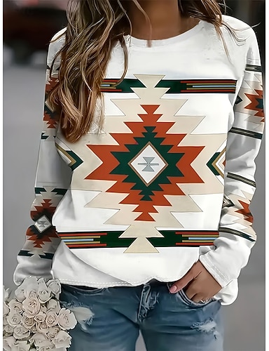 Per donna Tunica Grafico Geometrico Tribale Vintage Moda Elegante Manica Lunga Girocollo Top Regolari Quotidiano Stampato Bianco Primavera Autunno Inverno