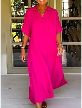 abito lungo da donna in cotone e lino, abito a camicia, abito casual, elegante, alla moda, moderno, per esterni, vacanze, per uscire, vestibilità ampia, tinta unita, maniche corte, colletto alla coreana, blu, nero, rosso, verde, estate, primavera