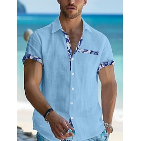 Per uomo Camicia di lino Camicia Guayabera Abbigliamento da spiaggia Camicia con Bottoni Alberi / foglie Casuale Spiaggia Blu marino Manica Corta Collo ripiegato Estate Primavera Abbigliamento