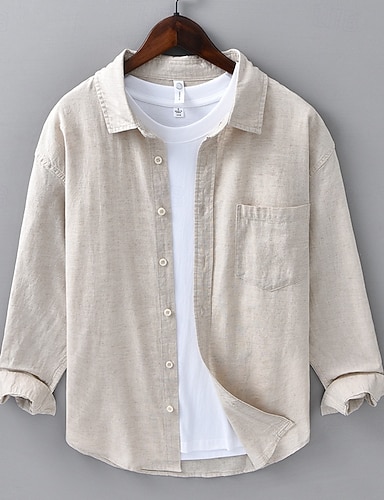Per uomo Camicia in cotone e lino Colore Solido / Tinta Unita Vacanza Abbigliamento quotidiano Nero Bianco Azzurro cielo Cachi Manica Lunga Bavero Abbigliamento Bottonato
