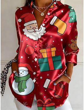 Natale Per donna Camicia Grafico Babbo Natale Vintage Elegante Casual Manica Lunga Colletto a Camicia Top Regolari Lavoro Quotidiano Ferie Bianco Rosso Verde Autunno Inverno