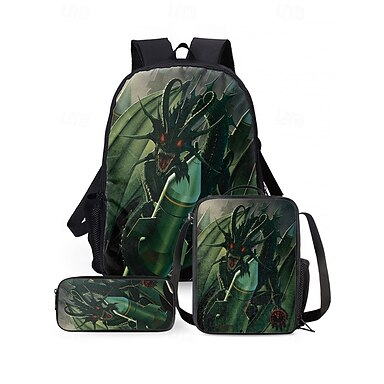 Set di 3 zaini da uomo a forma di drago con stampa di fiamme: resistente zaino scolastico, borsa termica per il pranzo e astuccio per matite per adolescenti amanti del ritorno a scuola e dello stile fantasy Kayomi Harai