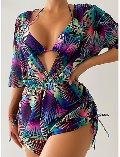 Costume da bagno 3 pezzi da donna bikini con palme,cheeky slim senza schienale per vacanze in spiaggia floreale color block scollo a V senza maniche maniche lunghe