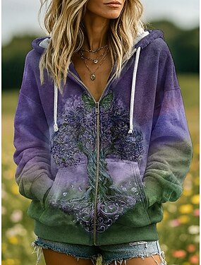 Felpa con cappuccio vintage boho 3D stampata per donna felpa patchwork felpa con cappuccio floreale chiusura lampo casual cappuccio abbigliamento quotidiano da strada patchwork tasca con zip viola