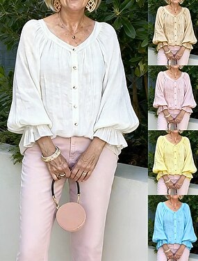 Per donna Camicia casual Camicia con Bottoni Finto cotone e lino Arricciato Bottoni Tinta unica Semplice Quotidiano Elegante Casual Manica Lunga Manica a Lanterna Scollo a V Top lunghi Quotidiano