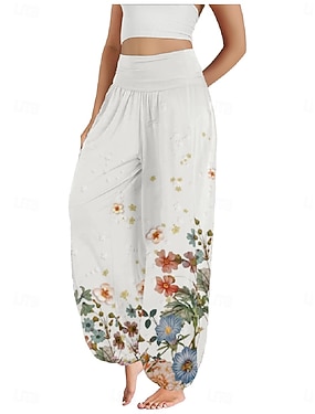 Per donna Pantaloni in cotone e lino Culotte Gamba Larga Chinos Pantaloni Estivi Vacanza Streetwear Essenziale Lunghezza intera Vita media Floreale Elastico in vita Stampa Comodo Comodità