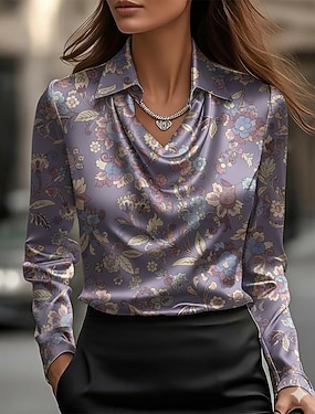 Per donna Camicia Elegant Top in raso A calotta di seta Stampato Drappeggiato Floreale Grafico Elegante Casual Manica Lunga Scollo a Cascata Top Regolari Quotidiano Lavoro Ferie Viola Primavera