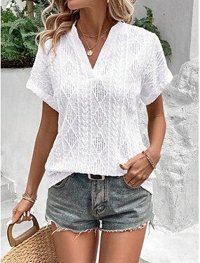 Per donna Maglietta Traforato Semplice Moda Moderno Casual Manica Corta Scollo a V Top Regolari Quotidiano Weekend Bianco Rosa Azzurro cielo Cachi Estate Primavera