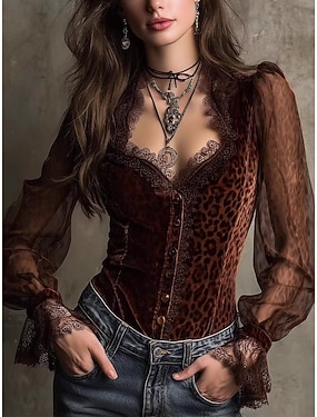 Per donna Camicia Blusa Top in pizzo Rete Leopardo Elegante Vintage Classico Manica Lunga Scollo a V Top Regolari Quotidiano Ferie Uscire Marrone Estate Primavera Autunno