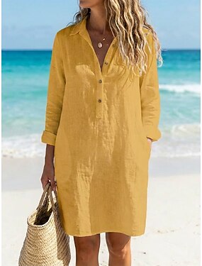 Per donna Abito al ginocchio Finto cotone e lino Abito Camicia Moda Moderno All'aperto Vacanza Ferie Vestibilità regolare Semplice Manica Lunga Colletto a Camicia Bianco Giallo Blu marino Estate