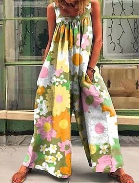 tuta normale da donna streetwear floreale senza maniche scollo a U tasca stampa finto cotone lino quotidiano strada vestibilità regolare blu verde chiaro estate