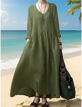 Abito maxi in cotone e lino da donna Abito a linea Abito casual Quotidiano Vestibilità ampia Panna Maniche lunghe V collo Nero Bianco Giallo Verde militare Estate Primavera Autunno