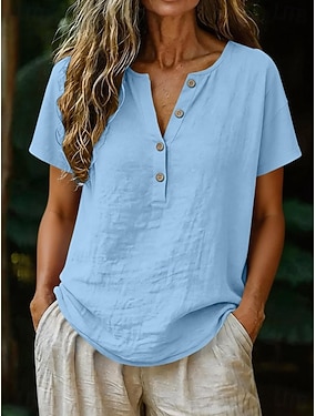 Per donna Maglietta Camicia di cotone Finto cotone e lino Volant Bottoni Tinta unica Moda Elegante Classico Manica Corta Scollo a V Top Regolari Quotidiano Uscire Weekend Blu Bianco Rosa Beige Estate