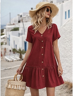 Per donna Mini Abito Finto cotone e lino Abito a trapezio Casual Quotidiano Vestibilità comoda Semplice Manica Corta Scollo a V Vino Estate Primavera