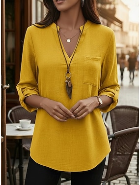 Per donna Camicie di cotone e lino Top estivi Blusa Top Eleganti Arricciato Patchwork Tasca Tinta unica Semplice Elegante Vintage Signore Manica 3/4 Colletto a Camicia Top Regolari Quotidiano Lavoro