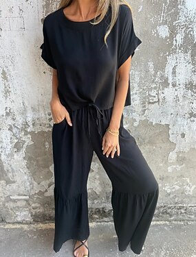 Per donna Set di Pantaloni Mezza Manica Girocollo Semplice Arricciato Patchwork Elegante Moda Streetwear Casuale Quotidiano All'aperto Blu Nero Rosso Estate Vestibilità comoda