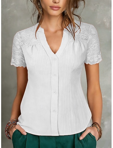Per donna Camicia Blusa Pizzo Bottoni Semplice Elegante Moderno Casual Manica Corta Scollo a V Top Regolari Quotidiano Ferie Uscire Blu Nero Bianco Giallo Vino Estate Primavera