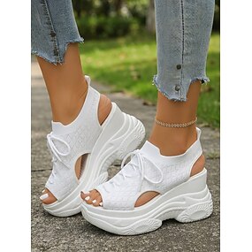 sandali da donna in Flyknit bianco con plateau e tomaia traspirante e chiusura con lacci, design sportivo alla moda per uscite casual, streetwear, avventure estive e uso quotidiano