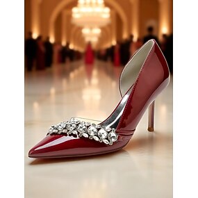 décolleté da donna in vernice rossa con decorazioni in strass, tacchi alti a punta per feste di lusso e cocktail.
