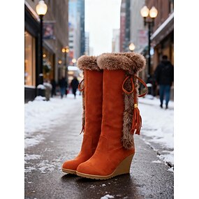 stivali da neve da donna con zeppa in pelle scamosciata arancione e rifiniture in pelliccia sintetica: stivali da neve eleganti e comodi con dettagli in nappa, caldi e comodi da indossare tutti i