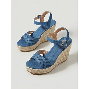 Sandali con zeppa in denim blu da donna - espadrillas casual con cinturini intrecciati e plateau con fibbia alla caviglia, ideali per crociere di lusso e resort tropicali. &eventi estivi sul terrazzo