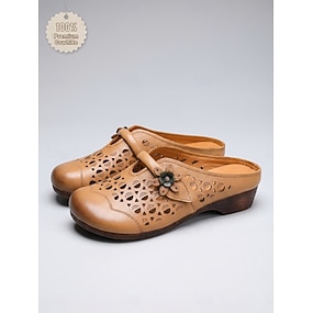 zoccoli da donna in pelle color cammello – scarpe slip-on traspiranti senza tallone con intagli e dettagli floreali per il giardino estivo &abbigliamento quotidiano