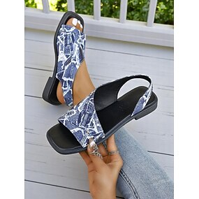 sandali da donna con punta aperta e stampa astratta in denim blu – sandali artistici con cinturino posteriore per le vacanze estive, resort e outfit casual
