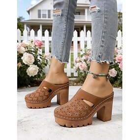 Mules da donna marroni con tacco a zeppa e intagli – scarpe estive con tacco grosso, perfette per occasioni casual, feste in giardino e per tutti i giorni.