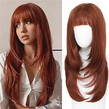 Parrucca lunga a strati color castano ramato con frangia, parrucche lisce color zenzero per donna, parrucca sintetica resistente al calore con capelli rossi per feste, cosplay, uso quotidiano.